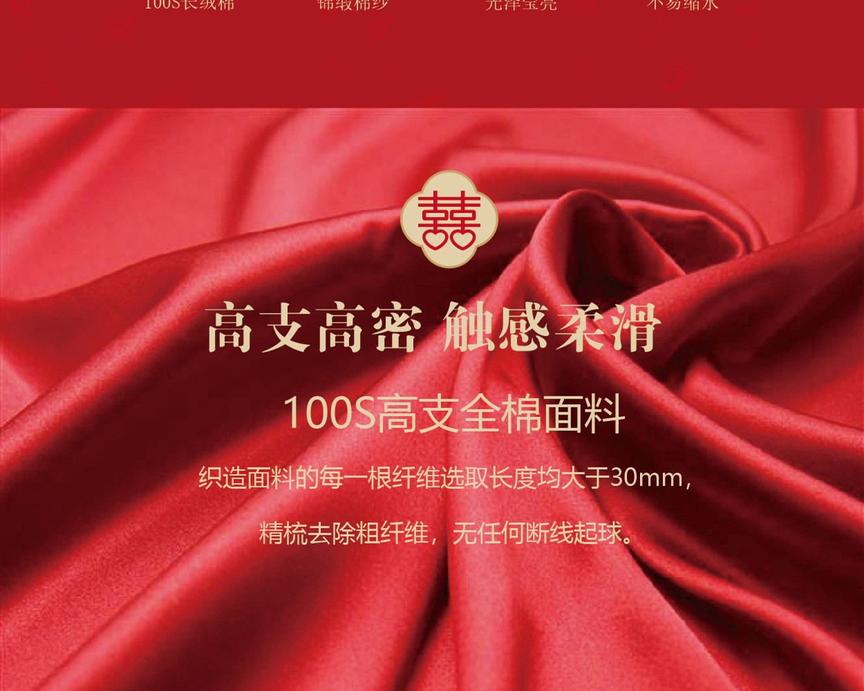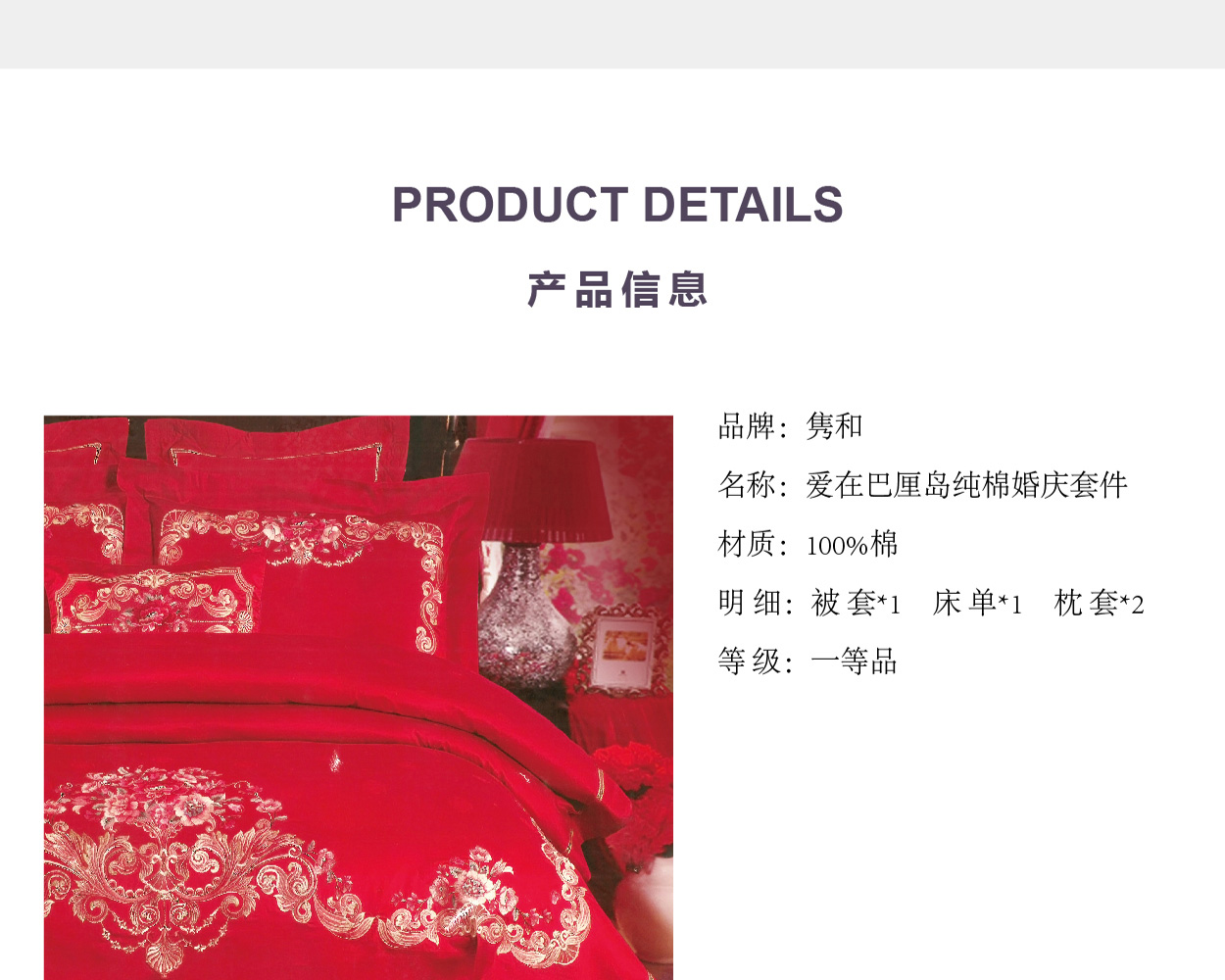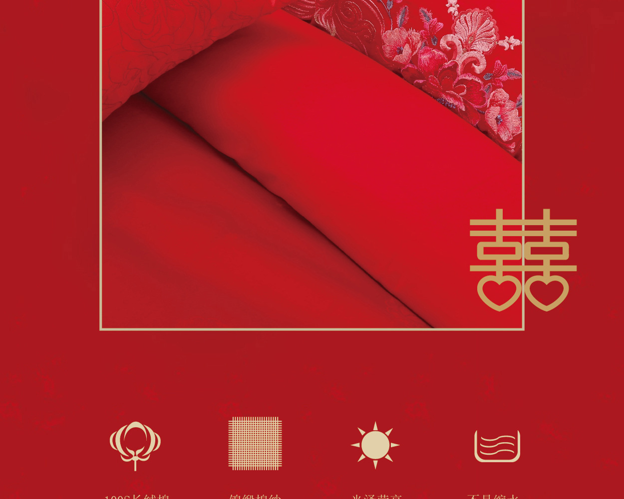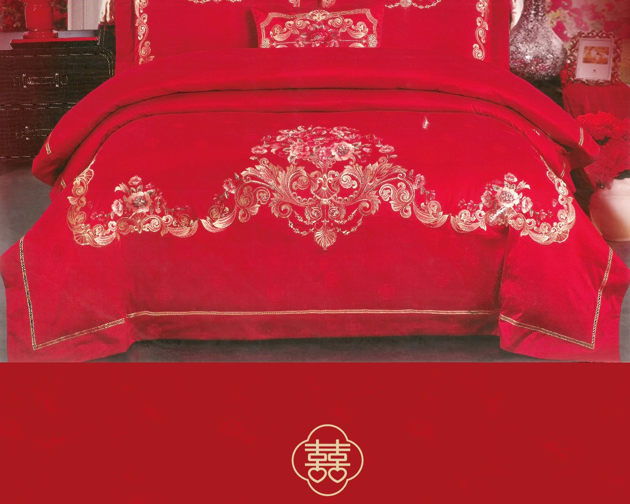 描述:大紅喜慶風(fēng)婚慶四件套,設(shè)計融入傳統(tǒng)婚慶意象,大紅花繡花寓意著愛情的甜美和一生的祝福,100%選用優(yōu)質(zhì)新疆長絨棉編織而成,比起普通全棉四件套具有縮水率低,不易掉色,更加柔軟親膚等特點,高支高密的雙色立體提花工藝,加上寫實的表現(xiàn)手法,讓圖案表現(xiàn)的更加細膩生動。
