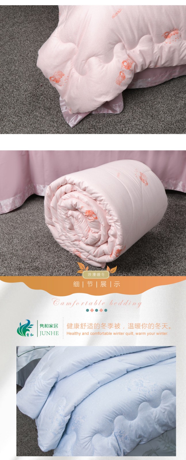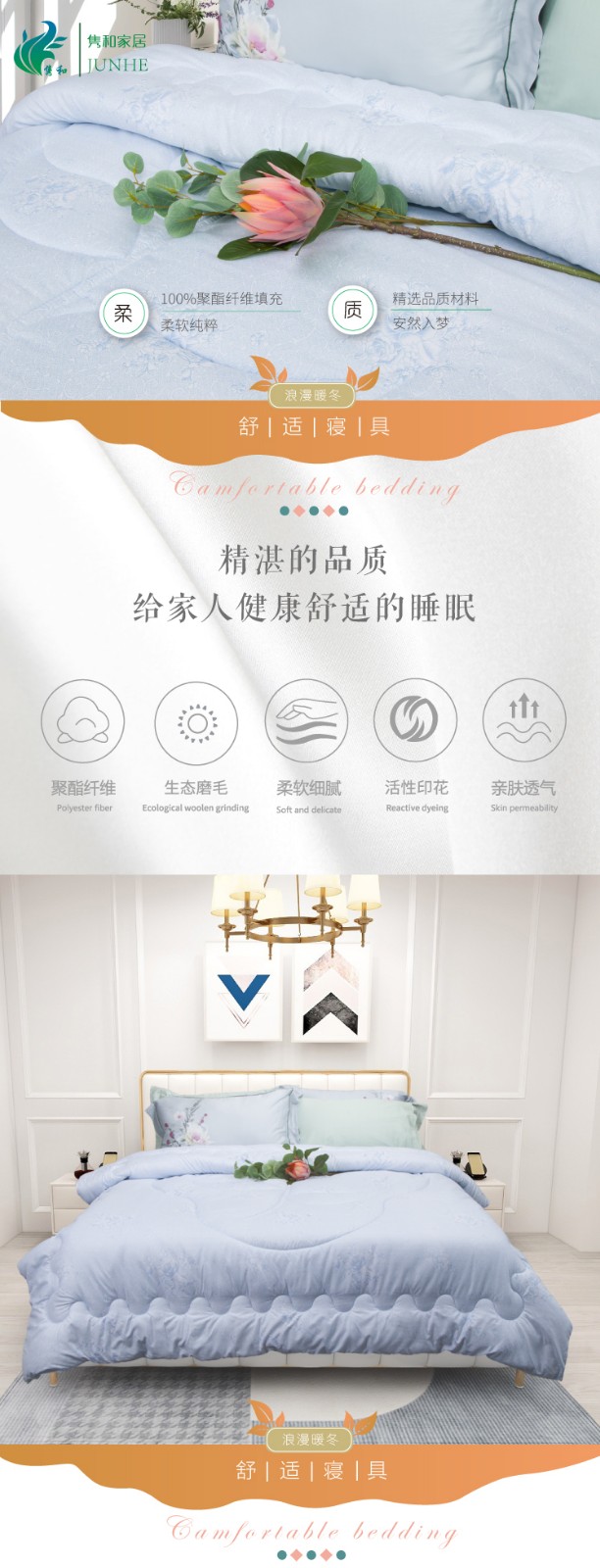描述:被芯全7孔棉填充,活性印花工藝、綠色健康、色牢度高、舒適耐用、精湛絎縫、大方邊角設(shè)計(jì)、保暖又大氣,兩色任選