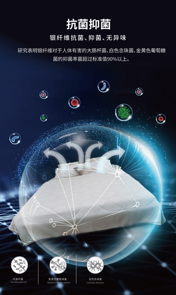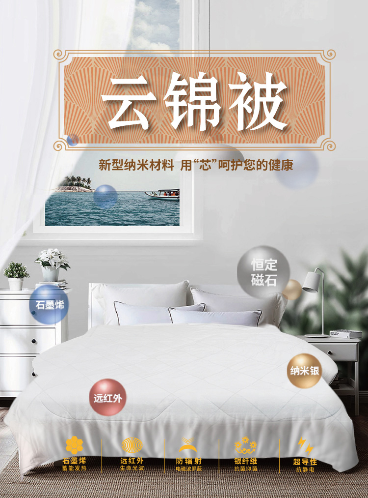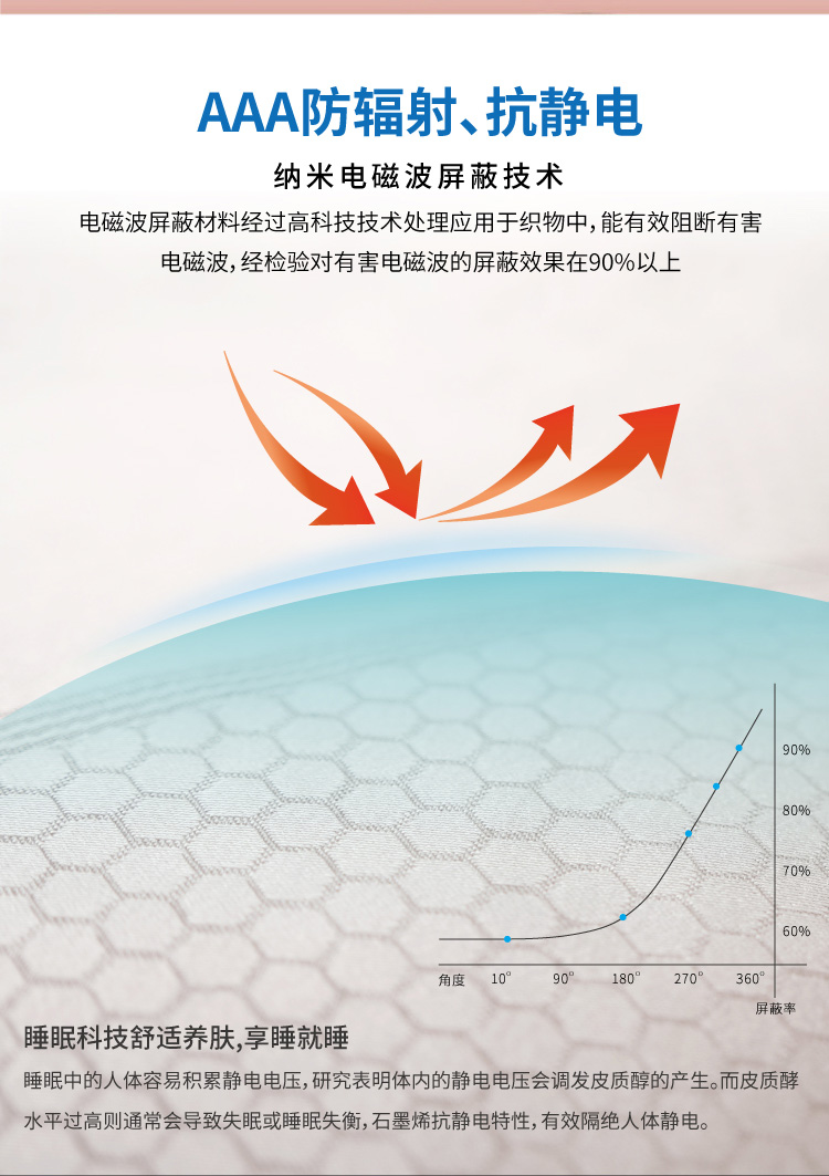 描述:具有石墨烯蓄能發(fā)熱.遠紅外生命光波,防輻射電磁波屏蔽,銀纖維抗菌抑菌、超導性抗靜電等功能,全面呵護您的睡眠健康,帶給你云一般的舒適體驗。